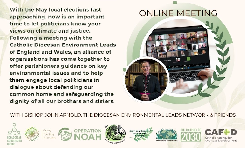 April 13th @ 6:30pm. ONLINE with Bishop John Arnold, The Diocesan Environmental Leads Network & Friends. With the May local elections fast approaching, now is an important time to let politicians know your views on climate and justice. Following a meeting with the Catholic Diocesan Environment Leads of England and Wales, an alliance of organisations has come together to offer parishioners guidance on key environmental issues and to help them engage local politicians in dialogue about defending our common home and safeguarding the dignity of all our brothers and sisters. Register here.